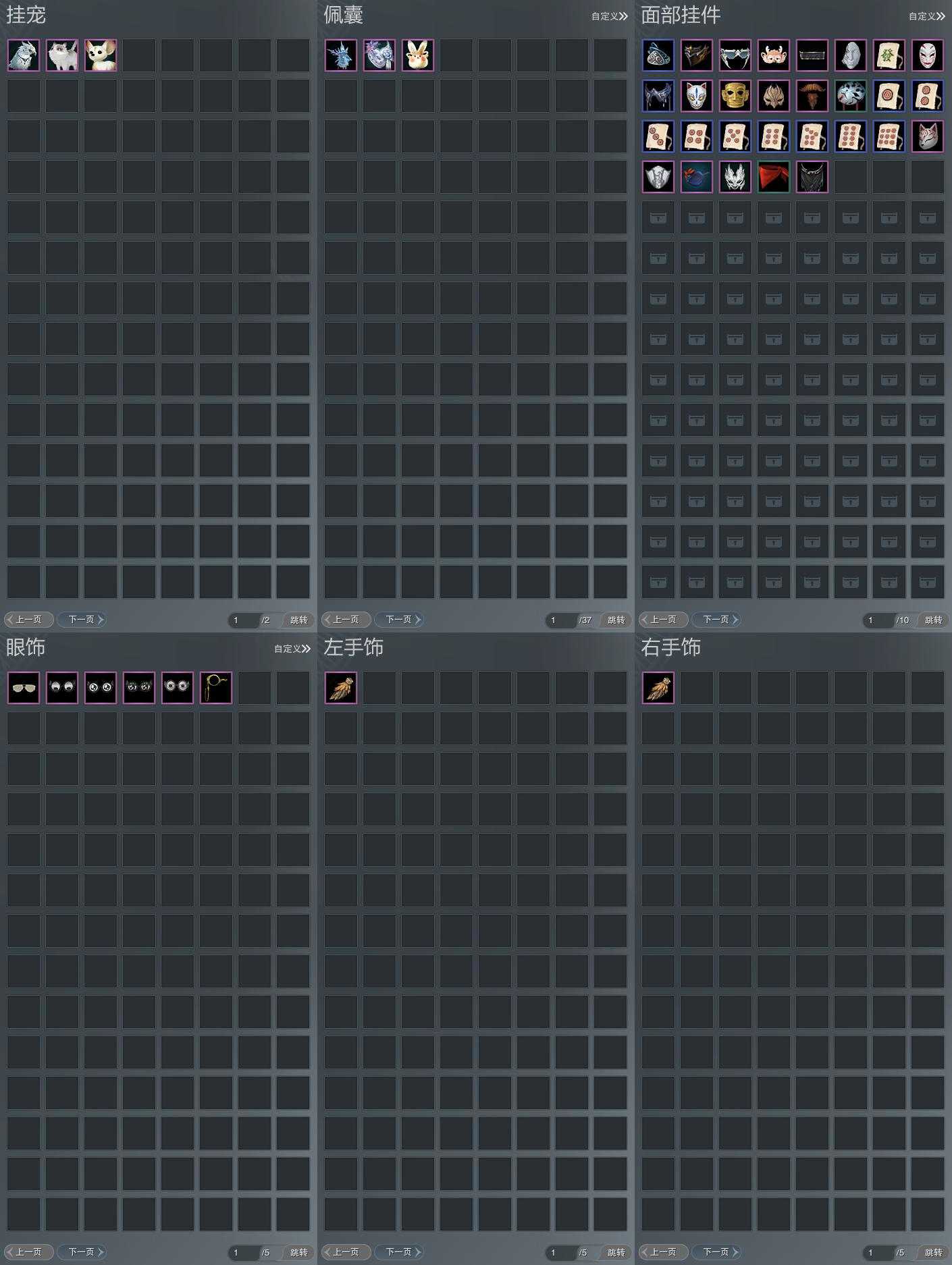 盒子:[叽盒, 红盒, 一七盒, 三七盒, 四代七夕盒, 五七盒(缺背挂), 貂盒, 青盒, 唐盒, 三代元宵盒, 孔雀盒, 红黑妖龙盒(标), 灵龙盒, 黑幽馥(标), 黑藏袍盒(标)]