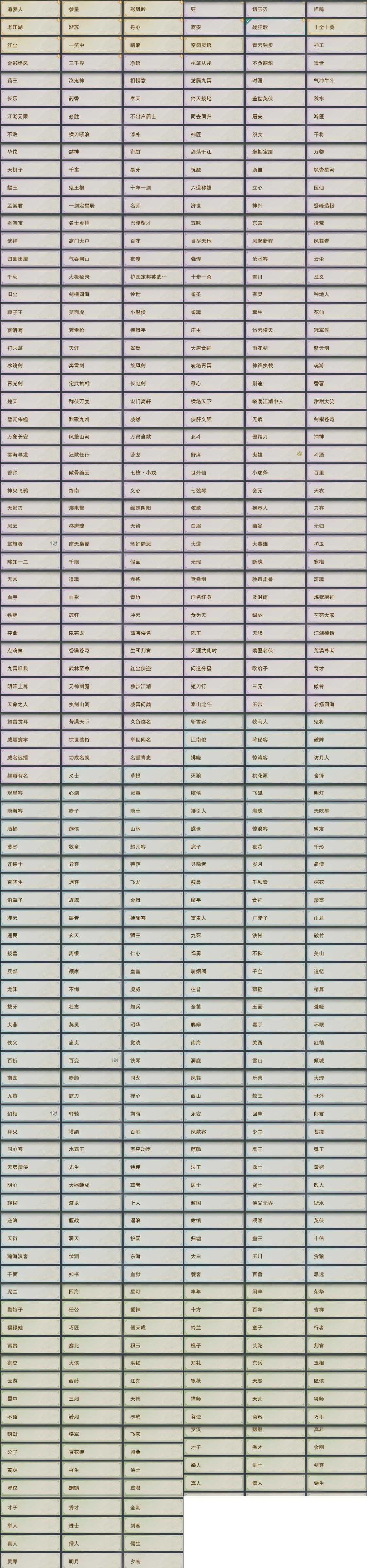 【奇遇】36个[白日梦, 天涯无归, 三山四海, 劝学记, 雪山恩仇, 阴阳两界, 莫负初心, 平生心愿, 黑白路, 惜往日, 乱世舞姬, 塞外宝驹, 争铸吴钩, 虎啸山林, 韶华故, 济苍生, 少年行, 故园风雨, 扶摇九天, 三尺青锋, 舞众生, 清风捕王, 侠行囧途, 寻猫记, 茶馆奇缘, 万灵当歌, 庆舞良宵, 生死判, 凌云梯, 炼狱厨神]