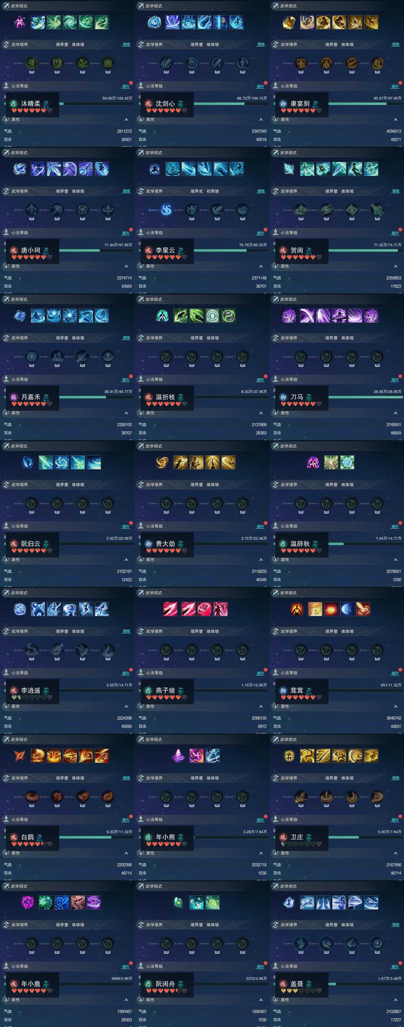 【同伴】沐晴柔86级境界壹,沈剑心86级境界壹,康宴别84级境界壹,唐小珂84级境界壹,李星云83级境界贰,贺闲意82级境界壹,月嘉禾79级境界壹,温折枝77级境界壹,刀马志75级境界壹,阮归云73级境界壹,费大劲73级境界壹,温辞秋70级境界壹,李逍遥70级境界壹,燕子娘69级境界壹,茸茸68级境界壹,白鹊慈68级境界壹,年小熊65级境界壹,卫庄志65级境界壹,年小鹿60级境界壹,阮闲舟60级境界壹,盖聂志59级境界壹