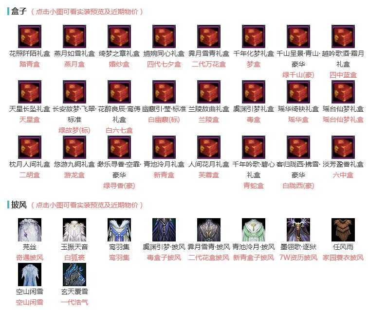 【披风】10个,[7W资历披风, 一代浩气, 奇遇披风, 毒盒子披风, 二代花盒披风, 新青盒子披风, 白狐裘, 鸾羽集, 空山闲雪]