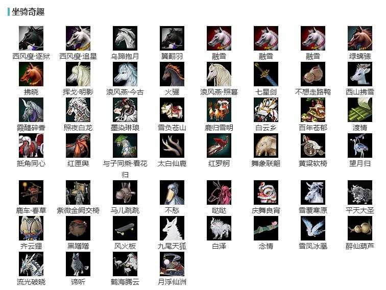 【坐骑】5个[西风瘦逐狱, 西风瘦追星, 乌蹄抱月, 挥戈明影, 浪风燕今古]
