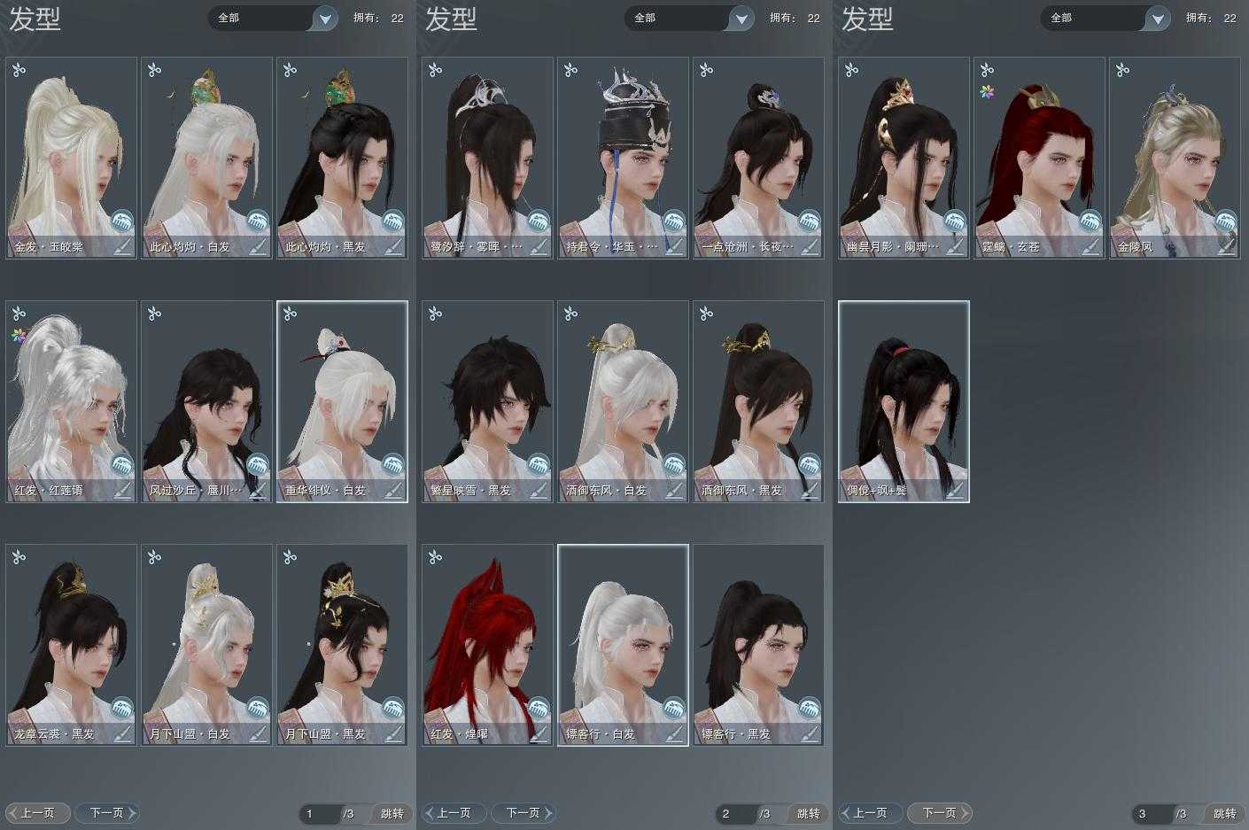 【发型】金发2个[一代金, 七中金发], 红发2个[兔红, 十六红], 黑发12个, 白发6个, 盒子发型[红幽昙黑发, 镖盒黑发, 卿酒盒黑发, 镖盒白发, 不良人盒黑发, 卿酒盒白发, 不良人盒白发, 黑沧洲盒黑发, 白持君盒黑发, 白鹭黑发, 九七黑发, 九七白发, 墨龙盒黑发, 蓝沙丘黑发, 十七黑发, 十七白发], 总页数3