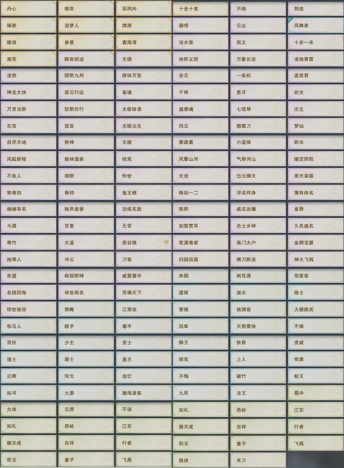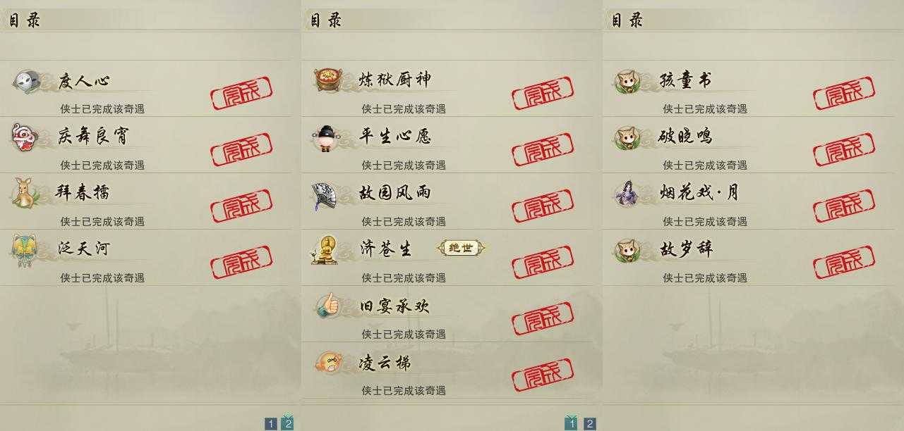 【奇遇】10个[平生心愿, 济苍生, 故园风雨, 庆舞良宵, 炼狱厨神, 凌云梯, 度人心, 旧宴承欢, 泛天河, 拜春擂]