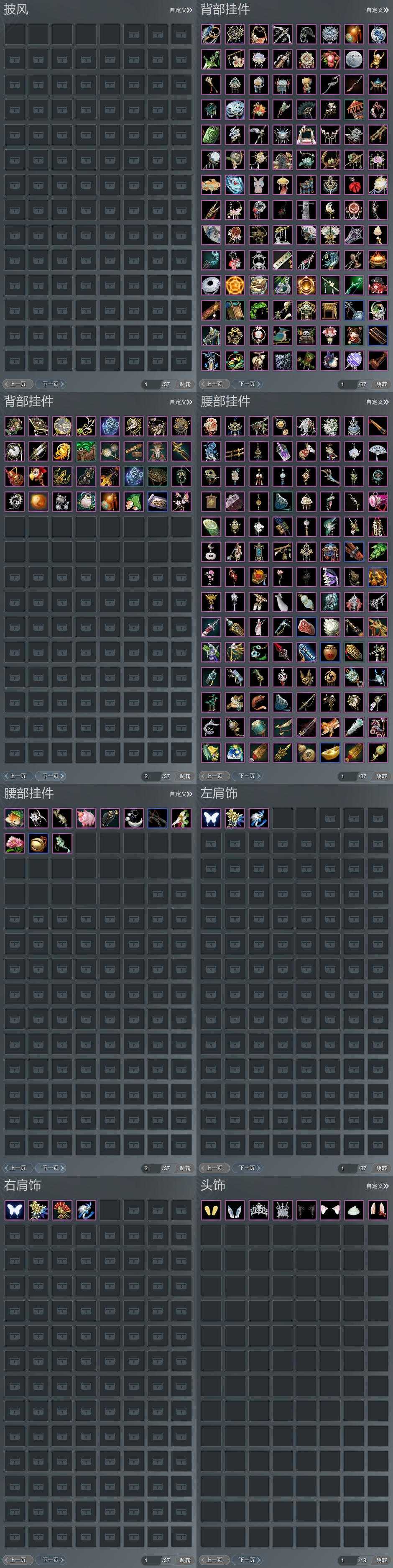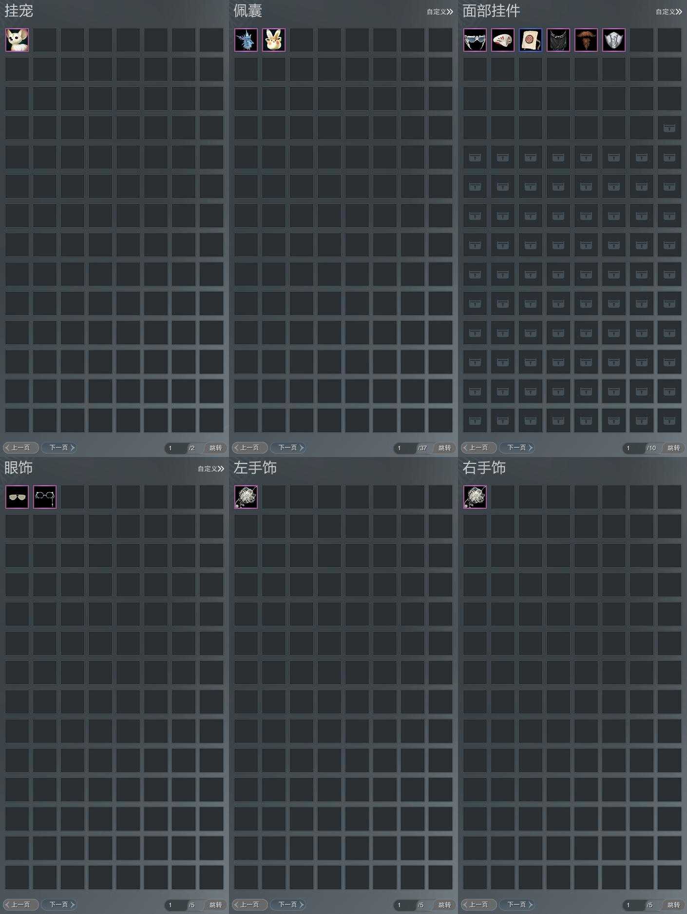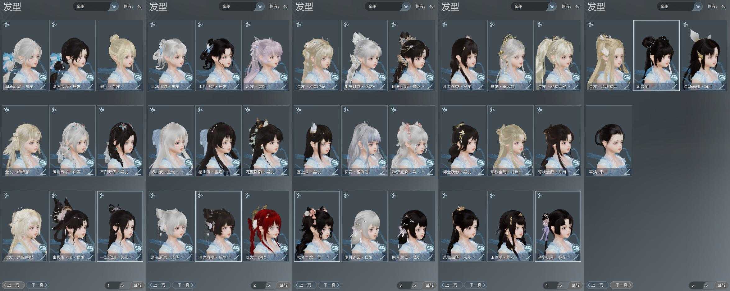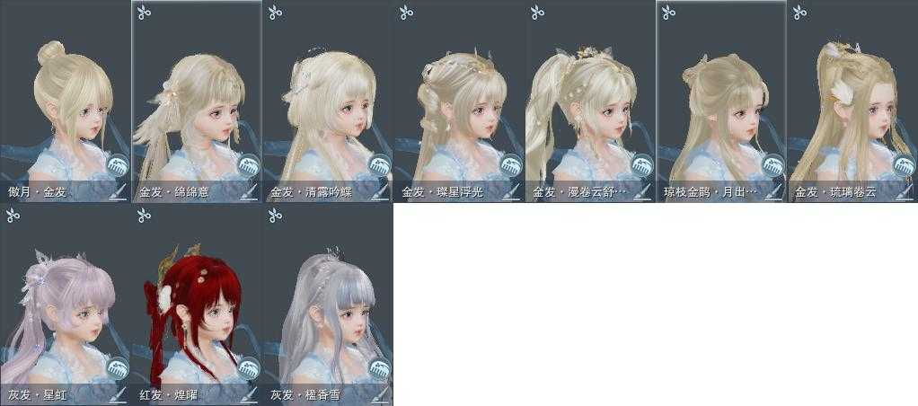 【发型】金发7个[龙女金, 云金, 雪金, 水母金, 咩金, 傲月金发, 澄琼枝金发], 红发3个[兔红, 二代灰, 一代灰], 黑发20个, 白发9个, 盒子发型[紫中秋黑发, 墨心黑发, 入梦黑发, 澄琼枝黑发, 小金龙黑发, 六代中秋黑发, 蝴蝶黑发, 蝴蝶白发, 羊盒黑发, 羊盒白发, 黑幽昙黑发, 绿幽昙白发, 蓝钻石盒黑发, 蓝椿山黑发, 踏青黑发, 蓝钻石盒白发, 蓝兔盒黑发, 蓝椿山白发, 黑沧洲盒黑发, 蓝兔盒白发, 白幽馥黑发, 潮涌盒黑发, 潮涌盒白发], 总页数5