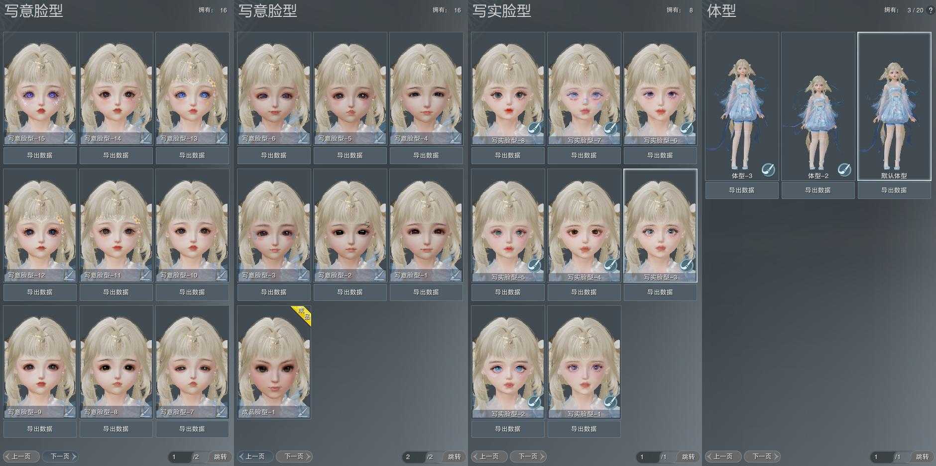 【捏脸】写意脸型16个,写实脸型8个,体型3个