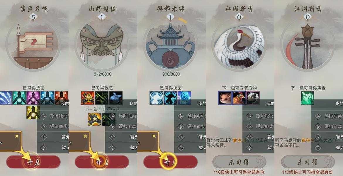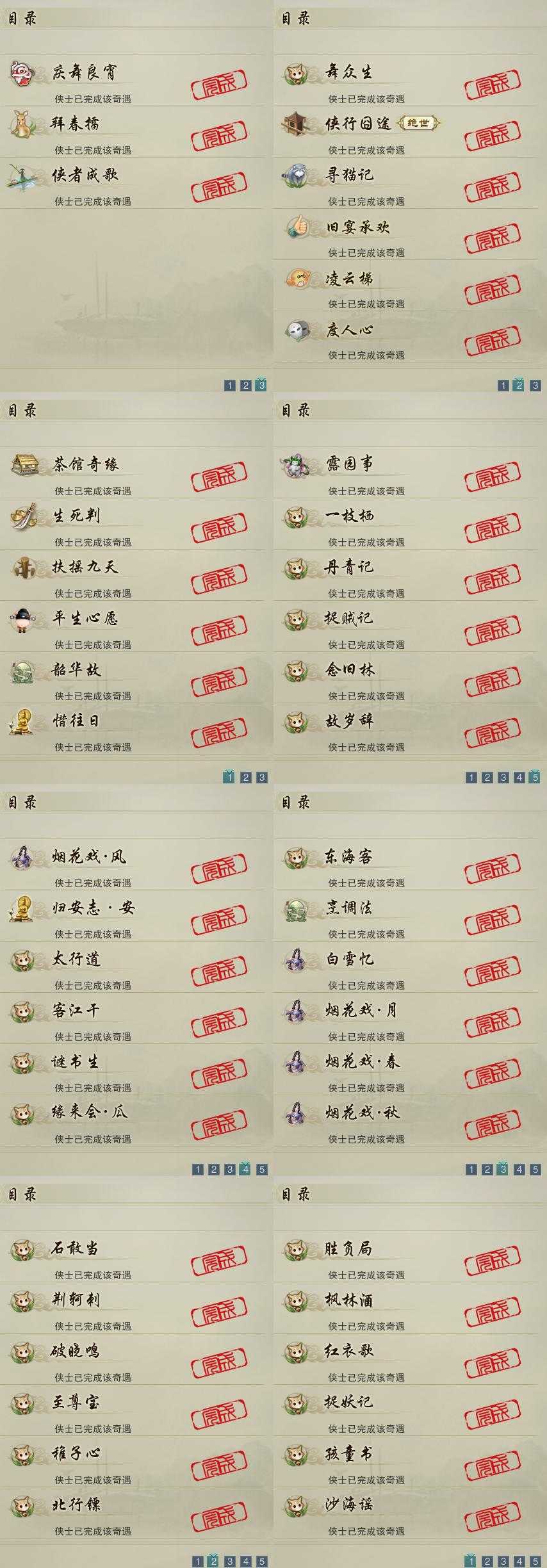 【奇遇】15个[平生心愿, 惜往日, 韶华故, 扶摇九天, 舞众生, 侠行囧途, 寻猫记, 茶馆奇缘, 庆舞良宵, 生死判, 凌云梯, 度人心, 旧宴承欢, 侠者成歌, 拜春擂]