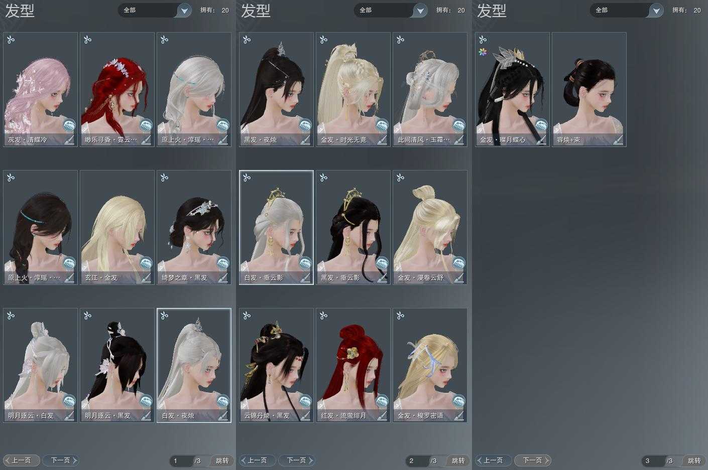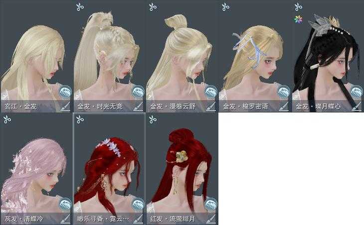 【发型】金发5个[狐金, 资历金, 时光金, 云金, 玄江金发], 红发3个[蝶粉, 小资历红, 紫寻香红发], 黑发6个, 白发5个, 盒子发型[蝴蝶黑发, 蓝异域白发, 蝴蝶白发, 婚纱盒黑发, 蓝上火黑发, 蓝上火白发], 总页数3