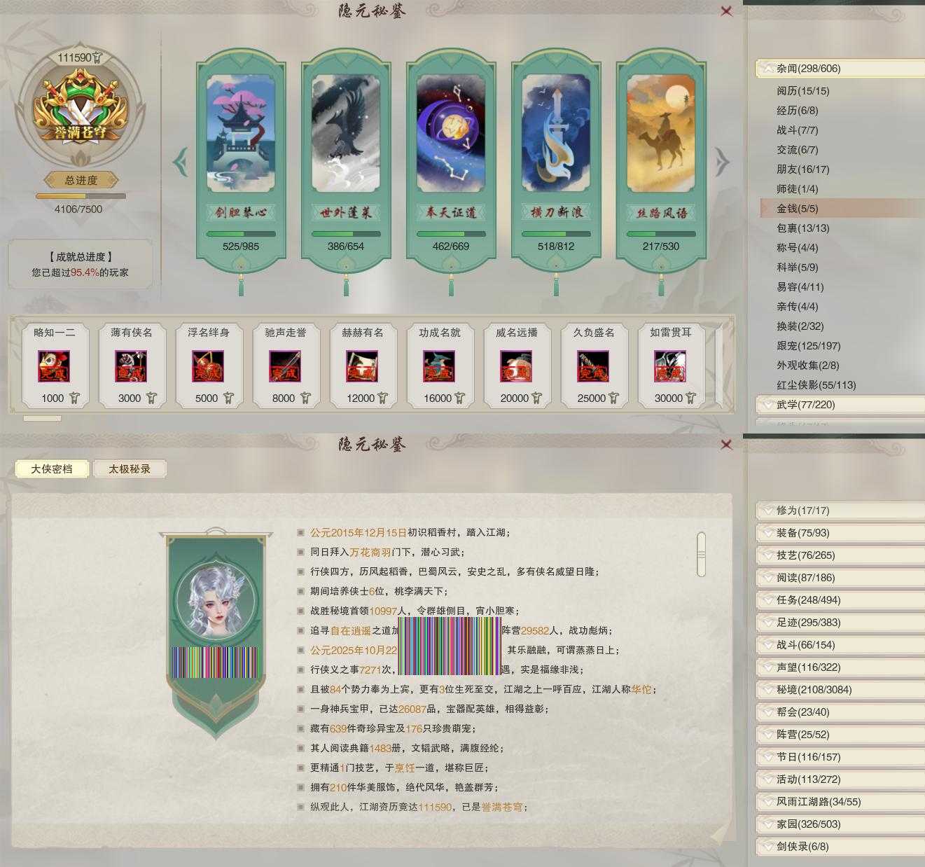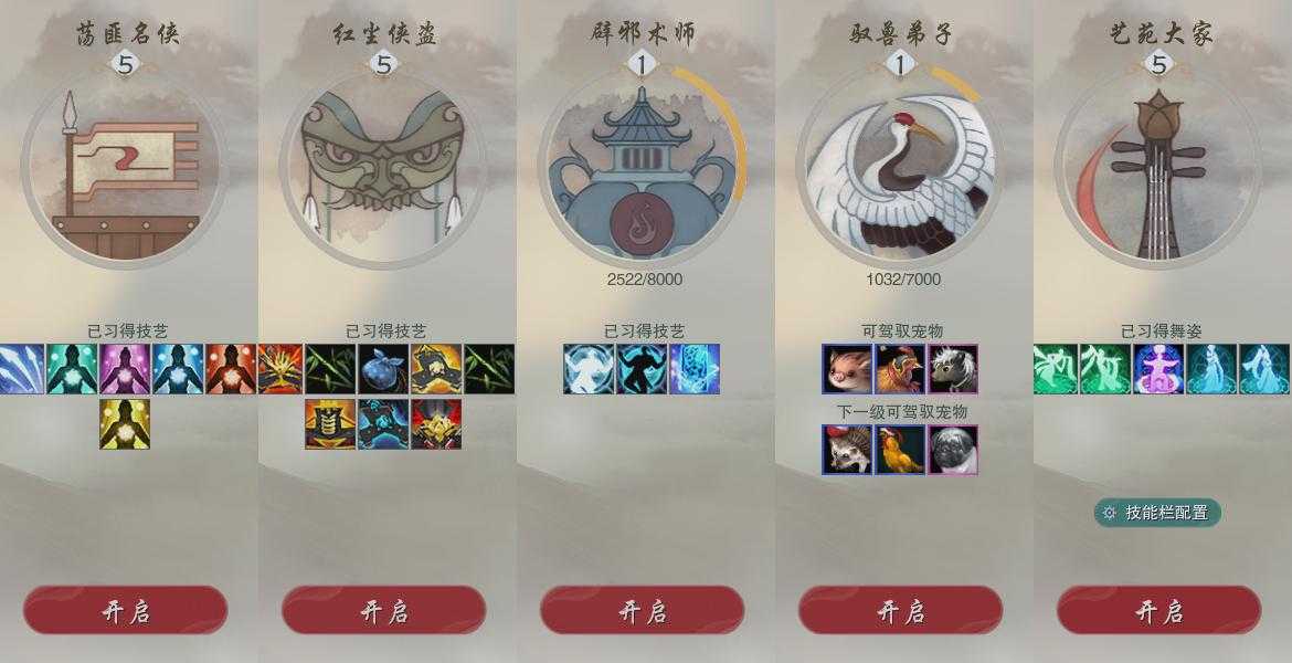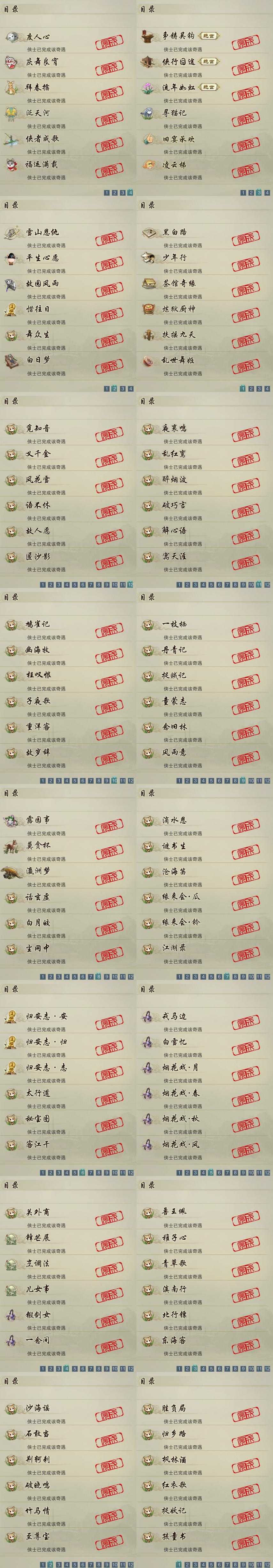 【奇遇】24个[白日梦, 雪山恩仇, 平生心愿, 黑白路, 惜往日, 乱世舞姬, 争铸吴钩, 少年行, 故园风雨, 扶摇九天, 流年如虹, 舞众生, 侠行囧途, 寻猫记, 茶馆奇缘, 庆舞良宵, 凌云梯, 炼狱厨神, 度人心, 旧宴承欢, 泛天河, 侠者成歌, 拜春擂, 福运满载]