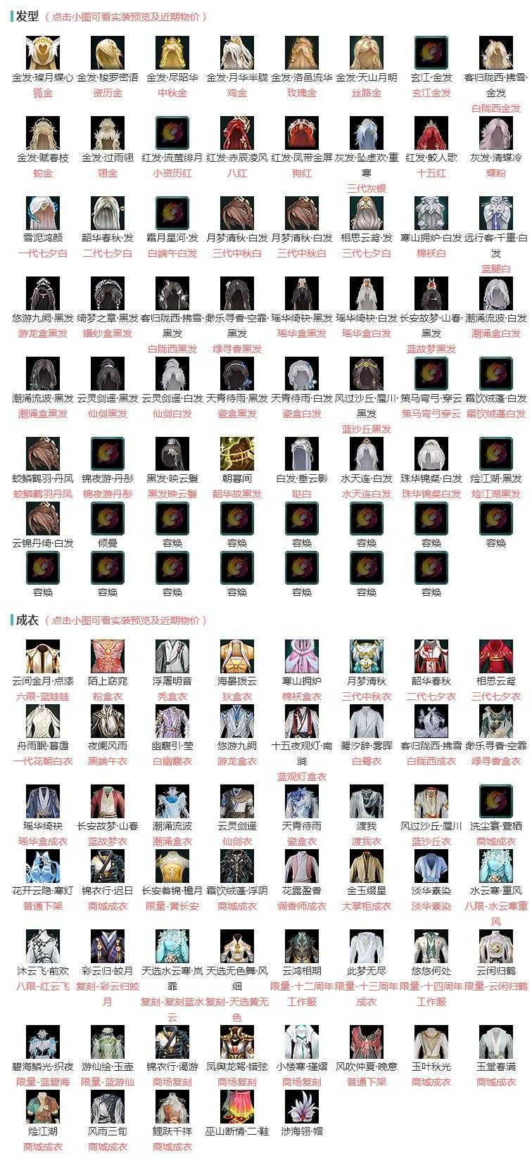 【发型】金发10个[狐金, 资历金, 中秋金, 鸡金, 玫瑰金, 丝路金, 玄江金发, 白陇西金发, 蛇金, 翎金], 红发6个[小资历红, 八红, 狗红, 三代灰银, 十五红, 蝶粉], 黑发12个, 白发10个, 盒子发型[一代七夕白, 二代七夕白, 白端午白发, 二代元宵白, 三代中秋白, 三代七夕白, 棉袄白, 蓝腿白, 游龙盒黑发, 婚纱盒黑发, 白陇西黑发, 绿寻香黑发, 瑶华盒黑发, 瑶华盒白发, 蓝故梦黑发, 潮涌盒白发, 潮涌盒黑发, 仙剑黑发, 仙剑白发, 瓷盒黑发, 瓷盒白发, 蓝沙丘黑发]
