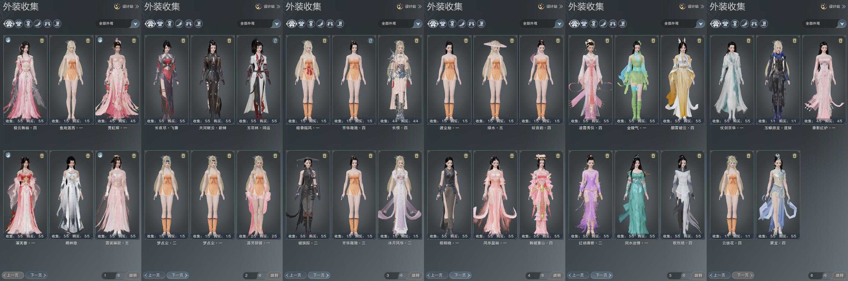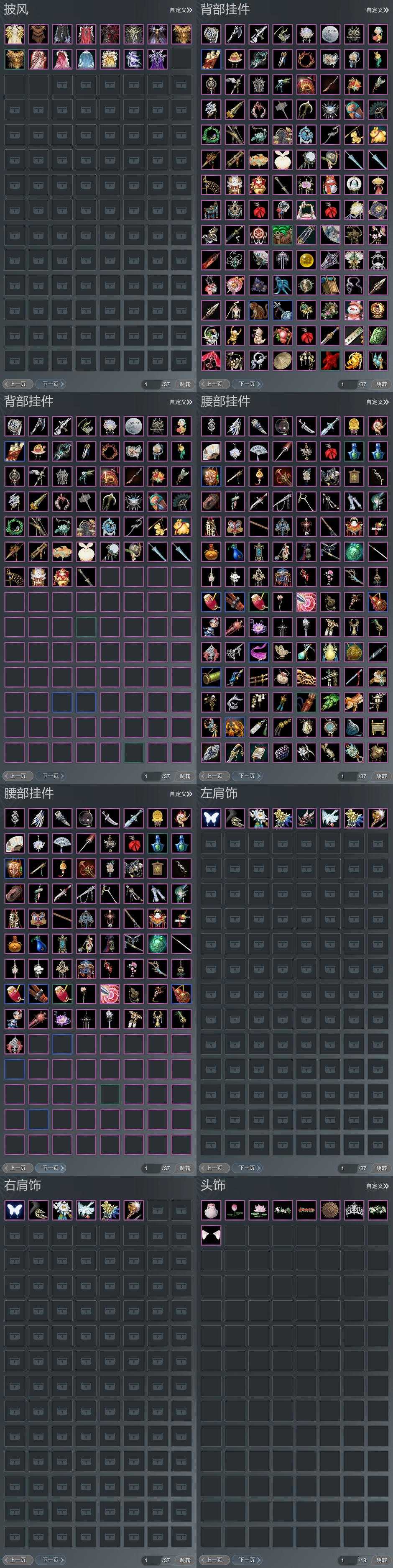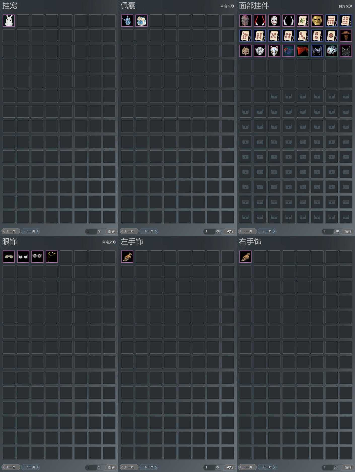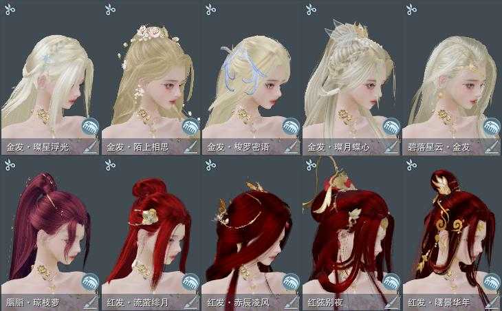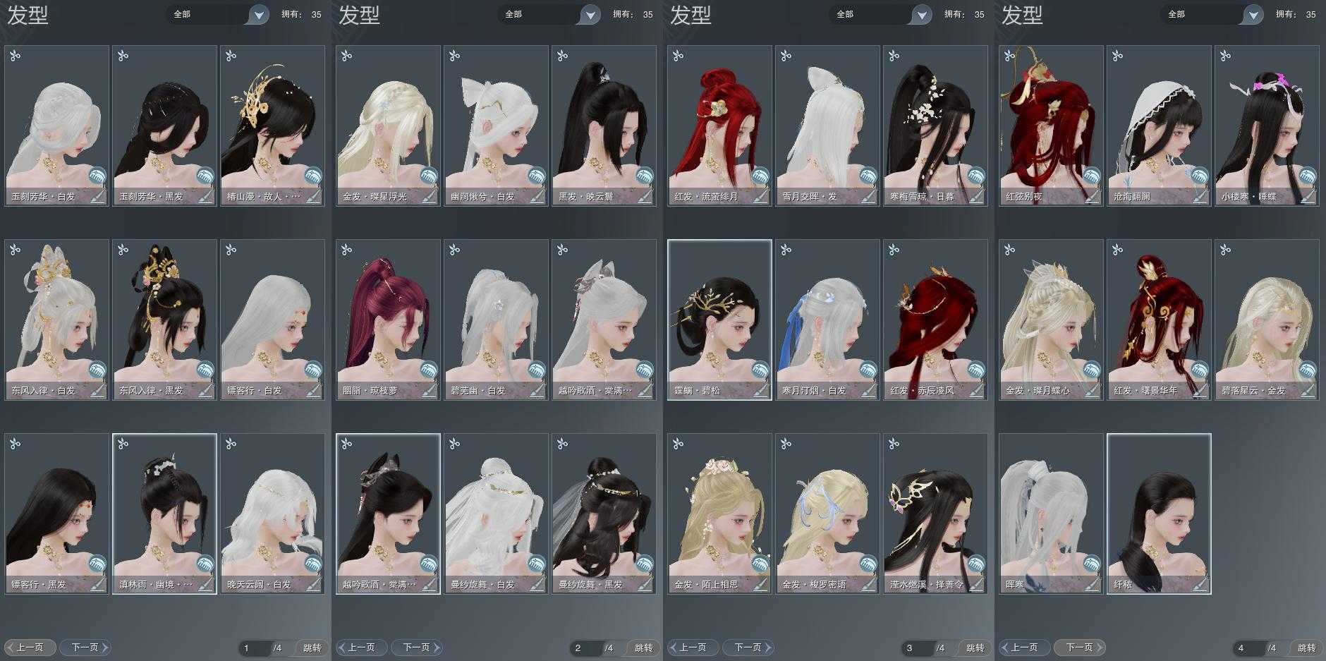 【发型】金发5个[狐金, 资历金, 考金, 苏金, 雪金], 红发5个[八红, 紫发, 猴红, 鸡红, 小资历红], 黑发13个, 白发11个, 盒子发型[丝路黑, 四代中秋粉黑发, 雪月白发, 丝路白, 四代中秋粉白发, 幽涧愀兮白发, 镖盒黑发, 黑傣族黑发, 除夕盒黑发, 镖盒白发, 黑椿山黑发, 除夕盒白发], 总页数4