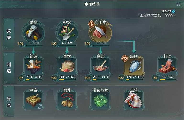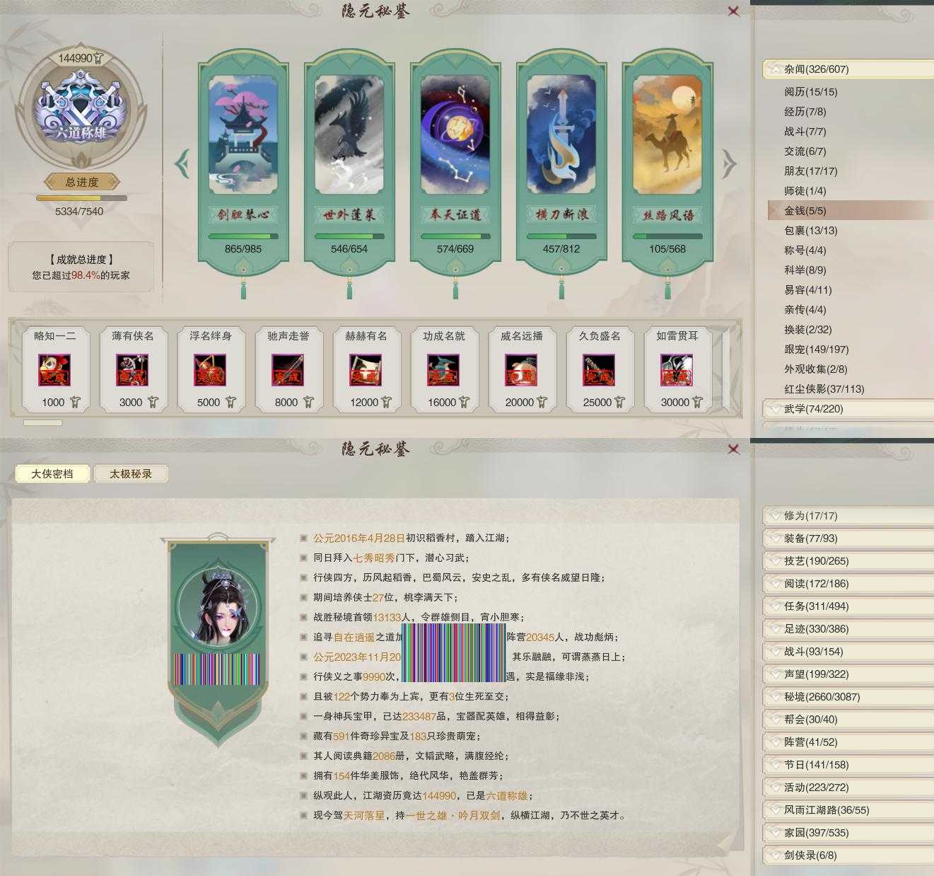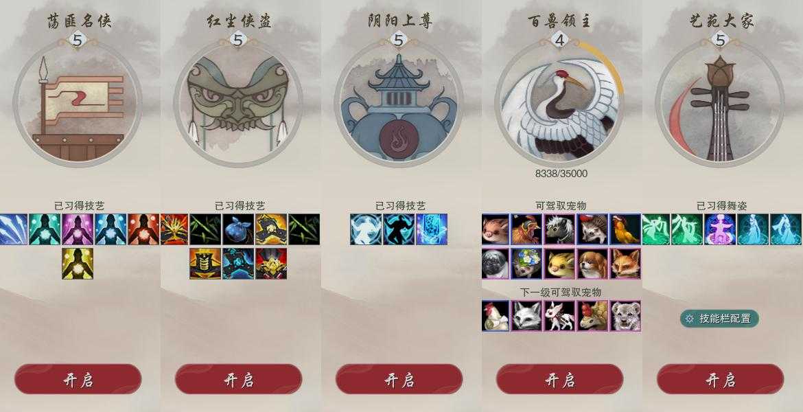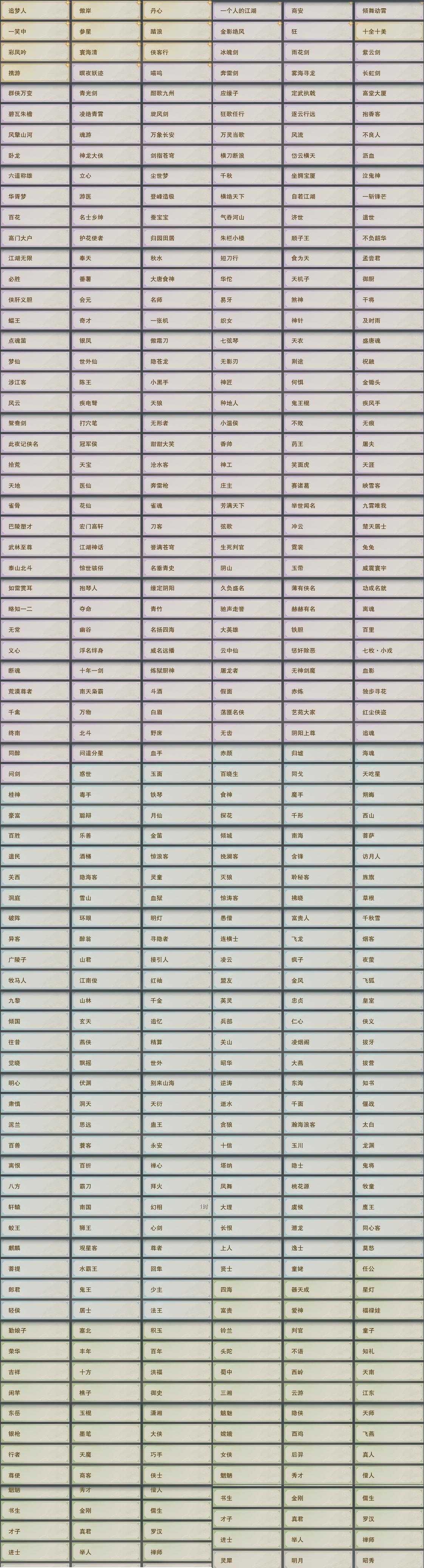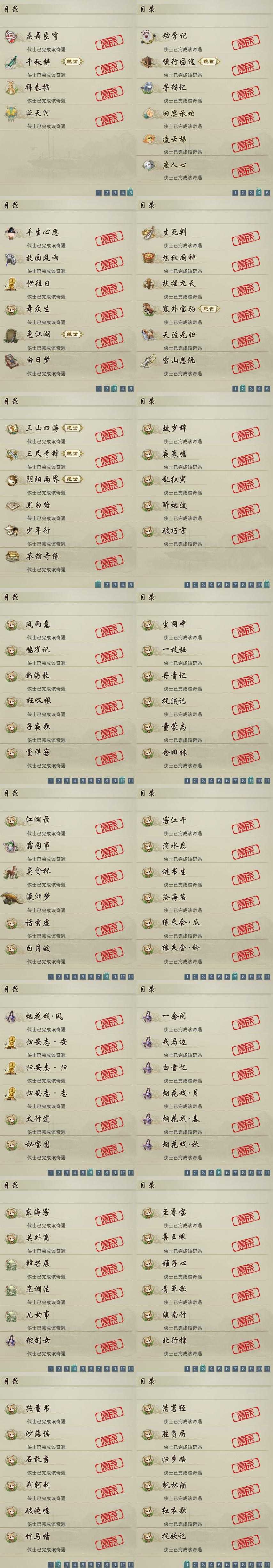 【奇遇】28个[白日梦, 天涯无归, 三山四海, 劝学记, 雪山恩仇, 阴阳两界, 平生心愿, 兔江湖, 黑白路, 惜往日, 塞外宝驹, 少年行, 故园风雨, 扶摇九天, 三尺青锋, 舞众生, 侠行囧途, 寻猫记, 茶馆奇缘, 庆舞良宵, 生死判, 千秋铸, 凌云梯, 炼狱厨神, 度人心, 旧宴承欢, 泛天河, 拜春擂]