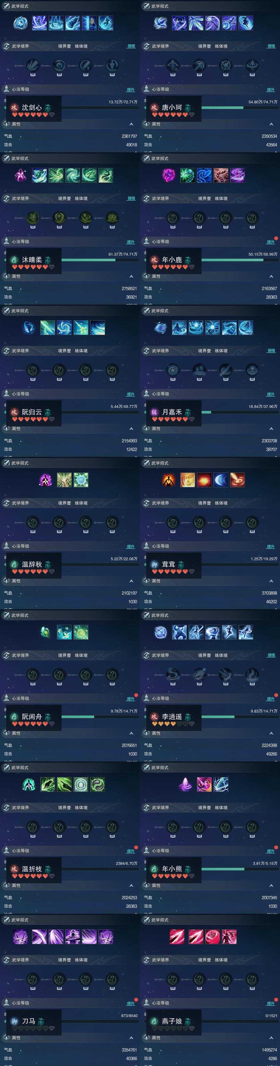 【同伴】沈剑心83级境界壹,唐小珂82级境界壹,沐晴柔82级境界壹,年小鹿80级境界壹,阮归云79级境界壹,月嘉禾77级境界壹,温辞秋73级境界壹,茸茸志72级境界壹,阮闲舟70级境界壹,李逍遥70级境界壹,温折枝64级境界壹,年小熊62级境界壹,刀马志48级境界壹,燕子娘1级境界壹