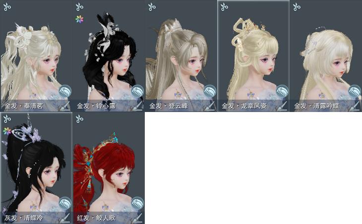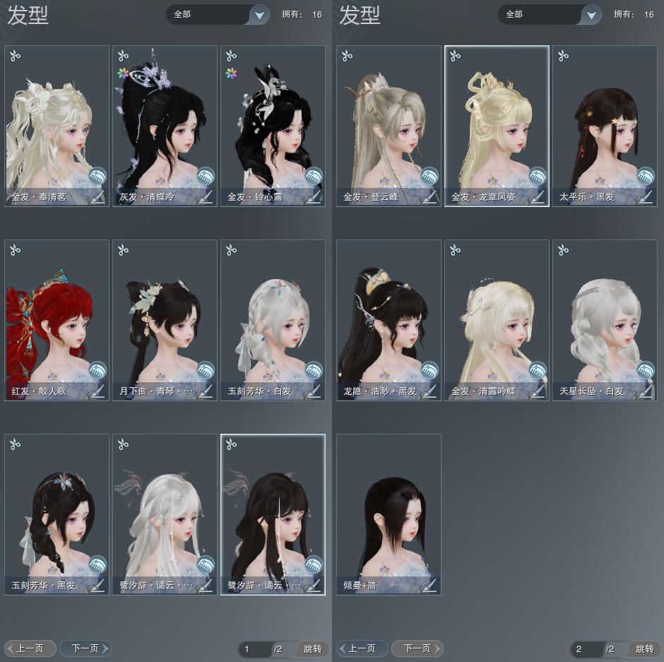 【发型】金发5个[水母金, 龙金, 三代金, 铃金, 金发奉清茗], 红发2个[蝶粉, 十五红], 黑发5个, 白发4个, 盒子发型[绿龙隐黑发, 天星盒白发, 粉鹭黑发, 蓝月下黑发, 粉鹭白发], 总页数2